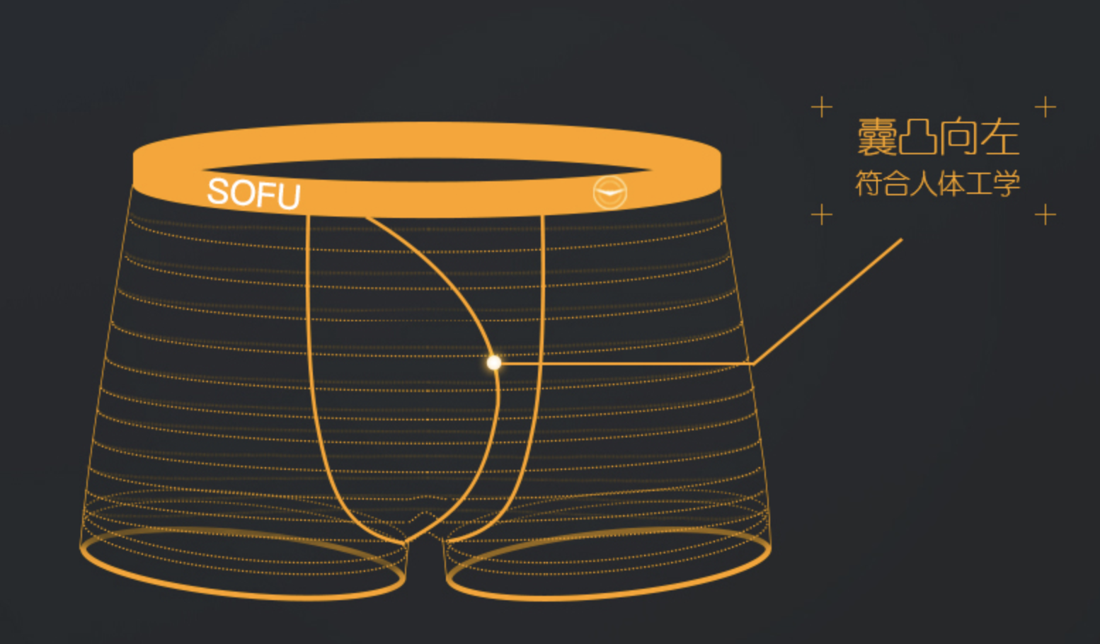 舒工坊SOFU STUDIO根據(jù)男性的人體工程學理論實驗,根據(jù)男性的生殖器官平時習慣向左傾斜的社會調(diào)查研究。將傳統(tǒng)內(nèi)褲通過前中線斜裁的方式解決了男性生殖器該放置哪里的問題,并且增加男士穿著的舒適性。